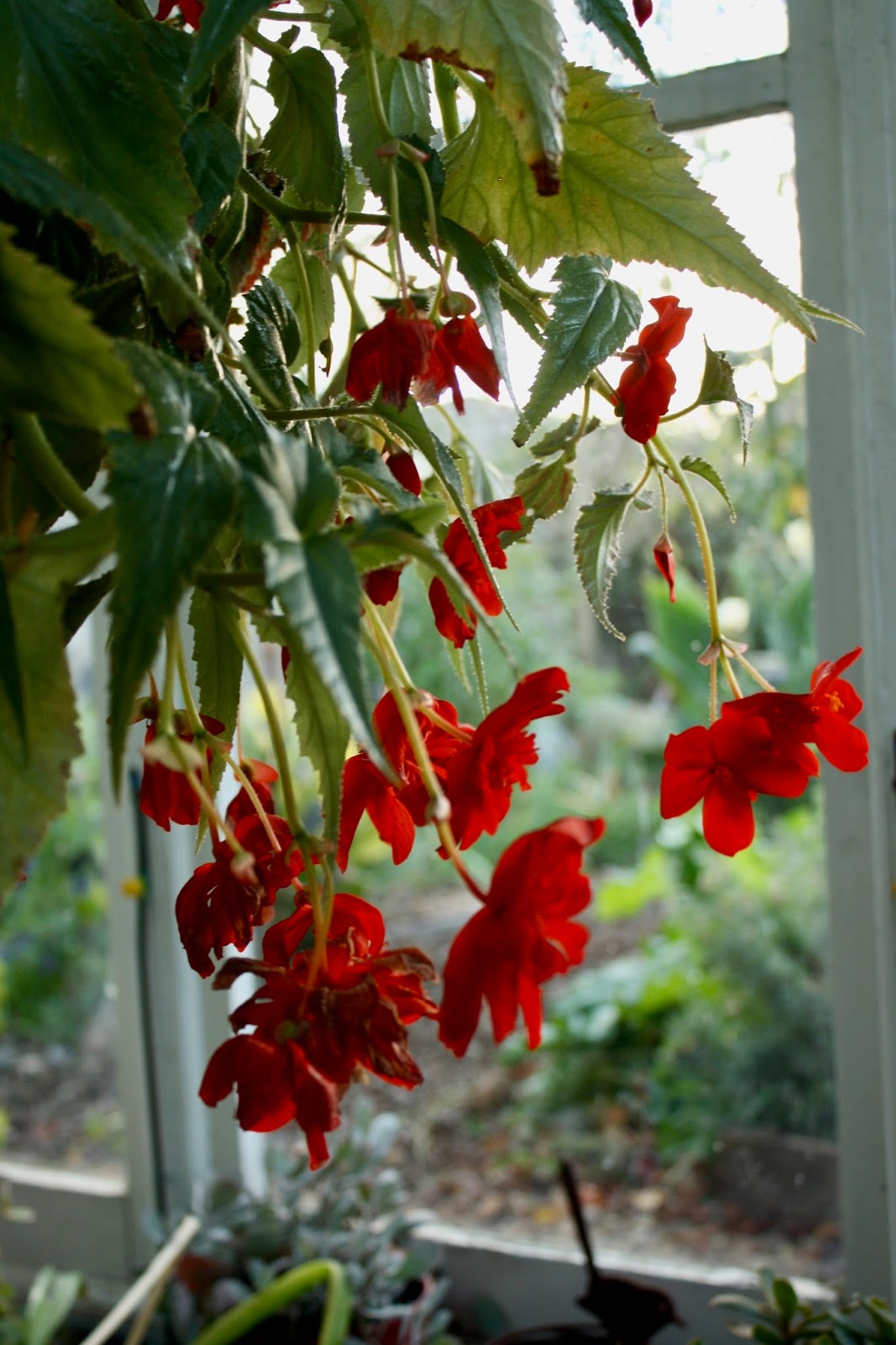 She has beautiful begonias, cascading from hanging baskets, bathing in the warmth ...